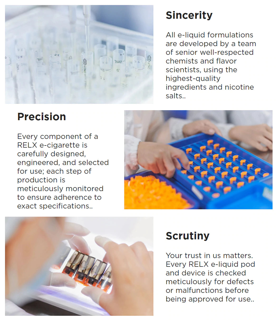 All RELX pod formulations utilize pharmaceutical-grade propylene glycol to stabilize the plant glycerin and tobacco oil emulsion. RELX’s propylene glycol suppliers meet the US Pharmacopeia's specifications and standards, ensuring consumer safety.