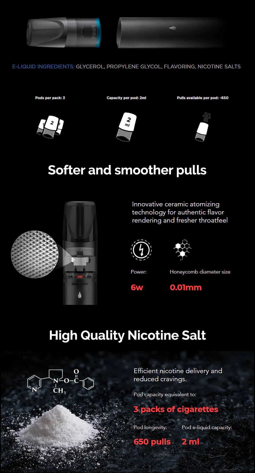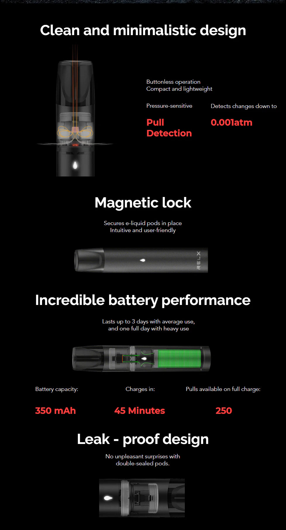 RELX offers you a dazzling array of flavored vape pods. We have flavors perfect for every mood or personality. Each RELXPod contains 2 milliliters of our special blend of glycerol, propylene glycol, rich flavoring, and nicotine salts. That’s enough fluid for approximately 650 pulls. Each RELXPod pack contains three units, or almost 2,000 pulls.